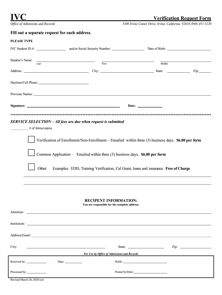 Verification Request FormOffice of Admissions and Records5500 Irvine Center Drive, Irvine, California 92618 (949) 4515220Fill out a separate request for each address. PLEASE TYPE IOC Student ID #: