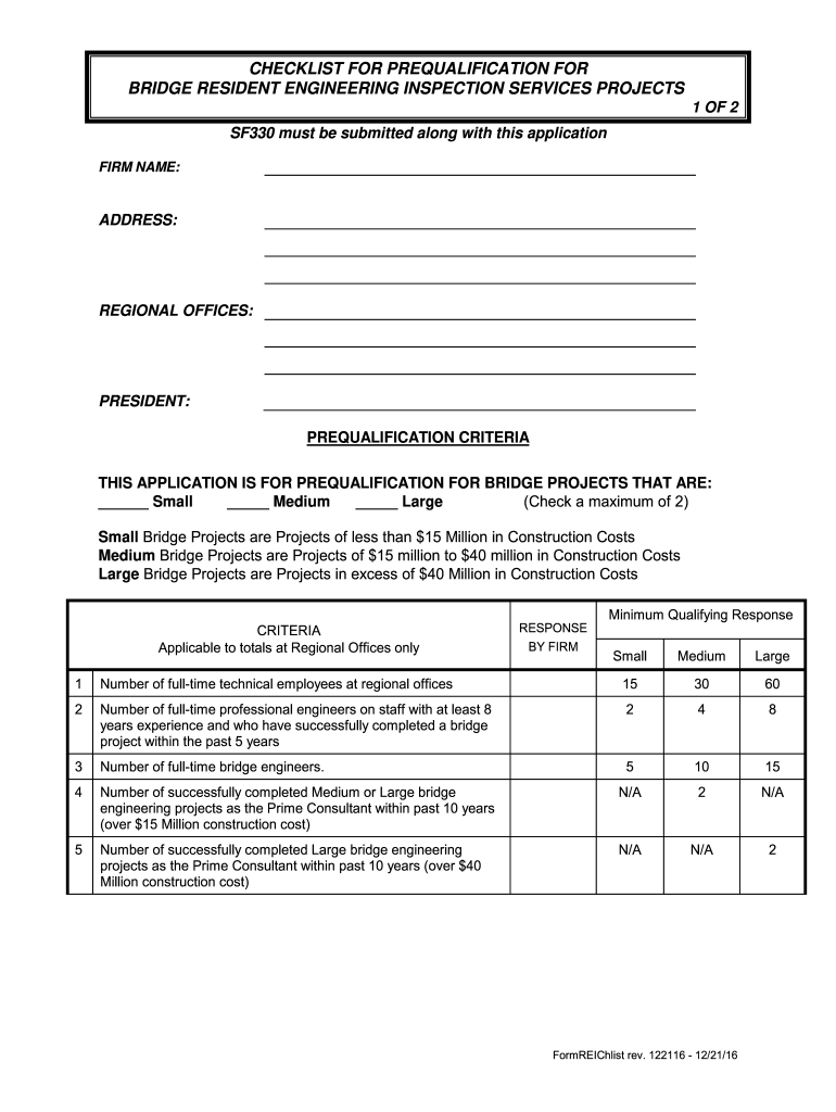 CHECKLIST FOR PREQUALIFICATION FOR BRIDGE RESIDENT ENGINEERING INSPECTION SERVICES PROJECTS 1 OF 2 SF330 must be submitted along with this application FIRM NAME:ADDRESS:REGIONAL OFFICES:PRESIDENT:
