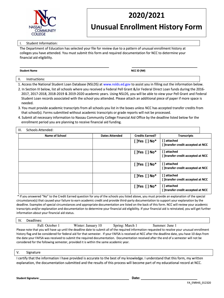 2020/2021 Unusual Enrollment History Form I. Student Information: The Department of Education has selected your file for review due to a pattern of unusual enrollment history at colleges you have