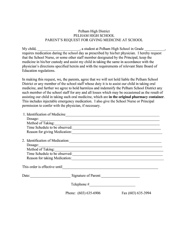 Pelham High District PELHAM HIGH SCHOOL PARENTS REQUEST FOR GIVING MEDICINE AT SCHOOL My child, a student at Pelham High School in Grade, requires medication during the school day as prescribed by