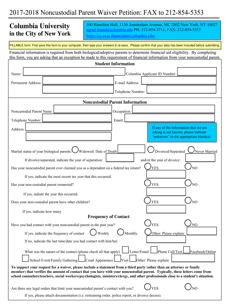 20172018 Noncustodial Parent Waiver Petition: FAX to 2128545353 100 Hamilton Hall, 1130 Amsterdam Avenue, MC 2802 New York, NY 10027 ugradfinaid Columbia.edu PH: 2128543711; FAX: 2128545353 https://ccseas.financialaid.columbia.edu/Columbia