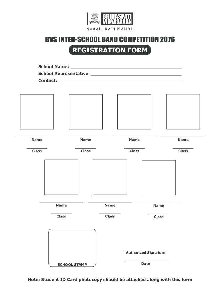 BVS INTERSCHOOL BAND COMPETITION 2076 REGISTRATION FORM School Name: School Representative: Contact: Name Classmate ClassNameName Classless Name Classmate Class Authorized Signature SCHOOL STAMPDateNote: