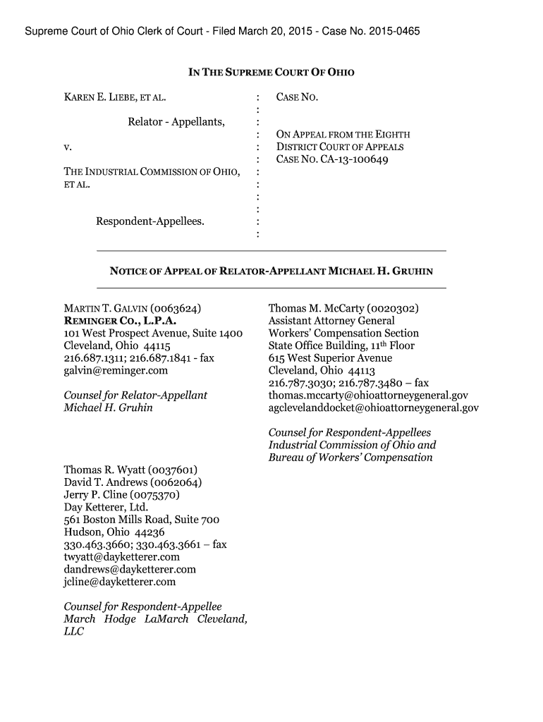 Supreme Court of Ohio Clerk of Court Filed March 20, 2015, Case No. 20150465IN THE SUPREME COURT OF OHIO KAREN E. LIEGE, ET AL.: CASE NO. Realtor Appellants, : : ON APPEAL FROM THE EIGHTH v. : DISTRICT