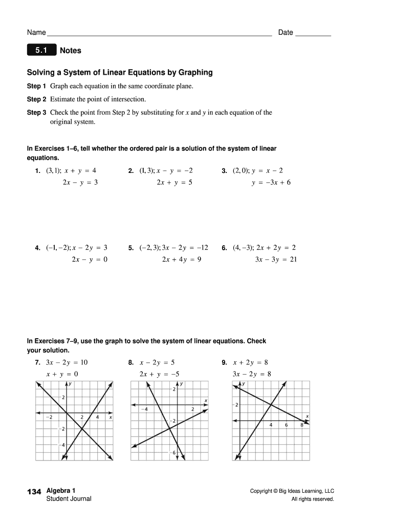 Name Date 5.1NotesSolving a System of Linear Equations by Graphing Step 1 Graph each equation in the same coordinate plane. Step 2 Estimate the point of intersection. Step 3 Check the point from Step
