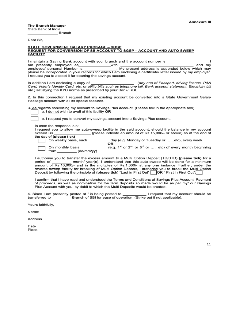Appendix III The Branch Manager State Bank of India Branch Dear Sir, STATE GOVERNMENT SALARY PACKAGE SSP REQUEST FOR CONVERSION OF SB ACCOUNT TO SSP ACCOUNT AND AUTO SWEEP FACILITY I maintain a Saving