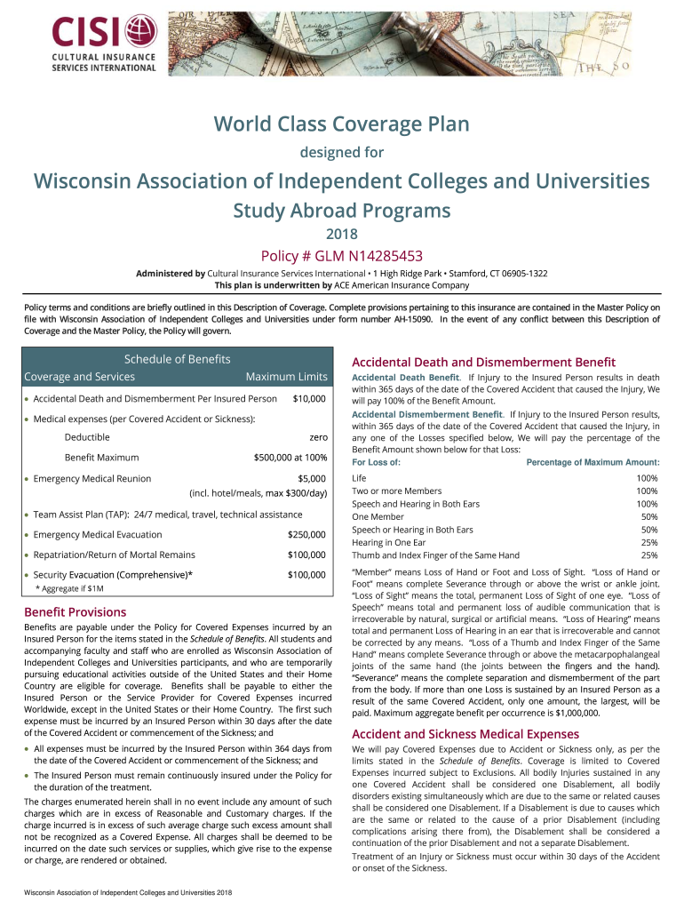 World Class Coverage Plan designed for Wisconsin Association of Independent Colleges and Universities Study Abroad Programs 2018 Policy # GLM N14285453 Administered by Cultural Insurance Services