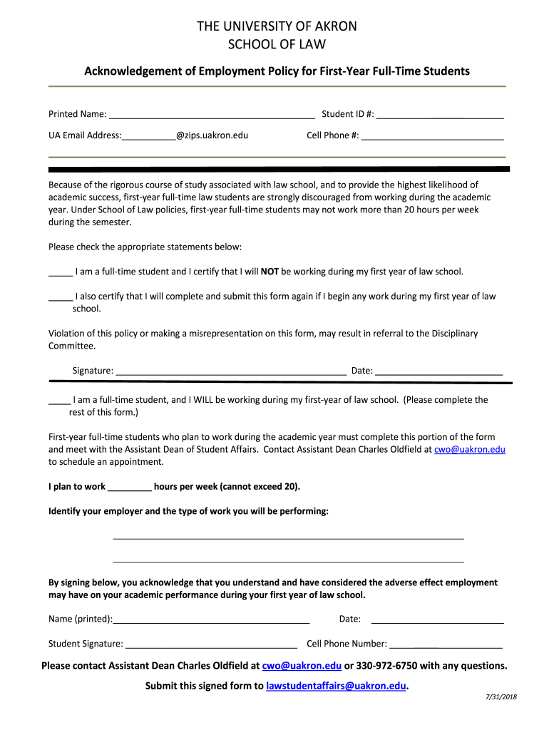 THE UNIVERSITY OF AKRON SCHOOL OF LAW Acknowledgement of Employment Policy for Firmware Halftime Students Printed Name: Student ID #: UA Email Address: zips. Akron.educe Phone #: Because of the rigorous