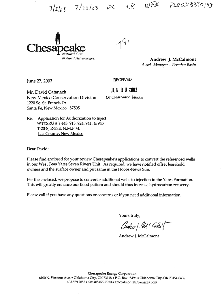 1Natural Gas. Natural Advantages. Andrew J. McCalmont Asset Manager Permian Basin RECEIVED June 27, 2003, Mr. David Cataract New Mexico Conservation Division 1220 So. St. Francis Dr. Santa Fe, New