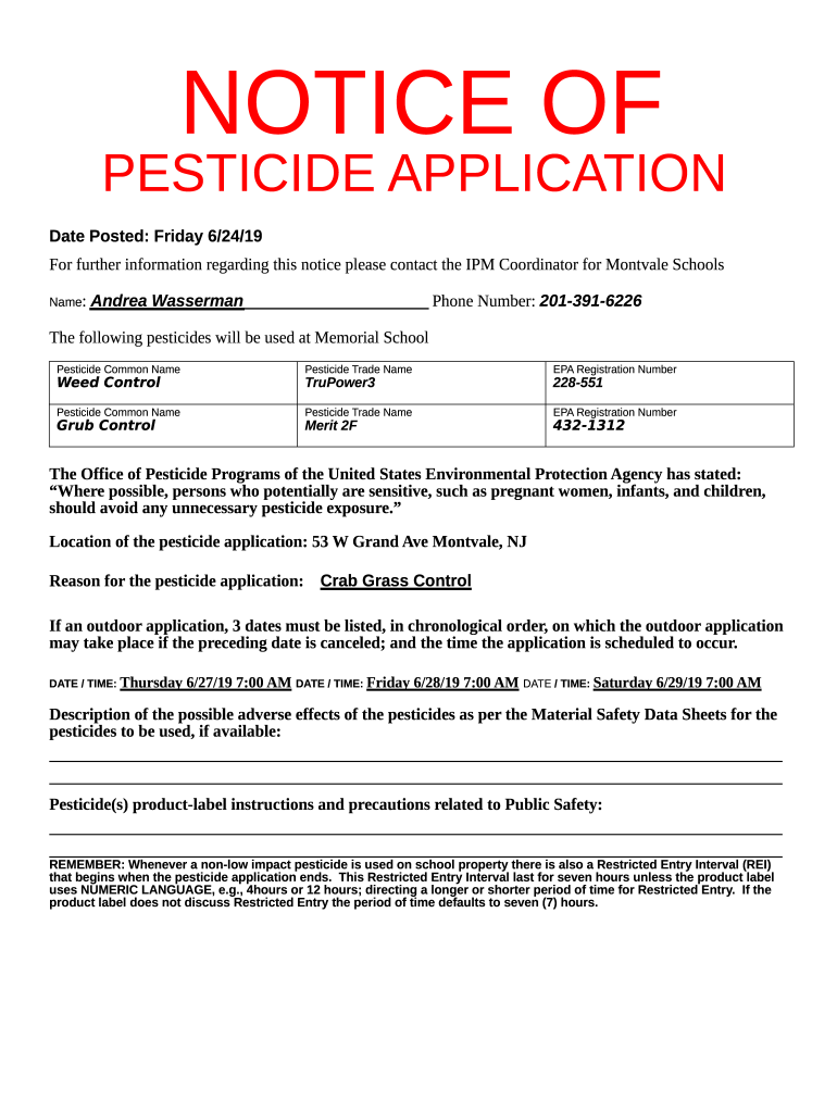 : Andrea WassermanPhone Number: 2013916226The following pesticides will be used at Memorial School