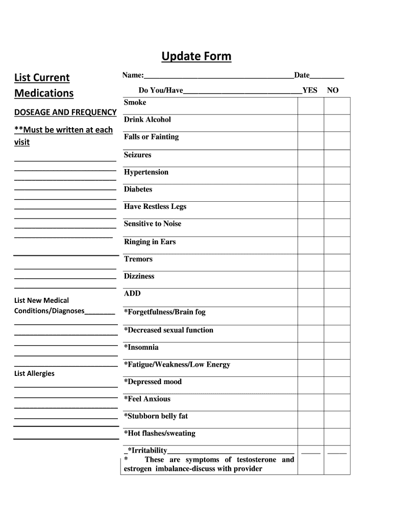 Update Form Date: Name: Date List Current Do You/Have YES NO MedicationsDOSEAGE AND FREQUENCY **Must be written at each visit Delist New Medical Y N Conditions/Diagnoses These are provider List Allergies