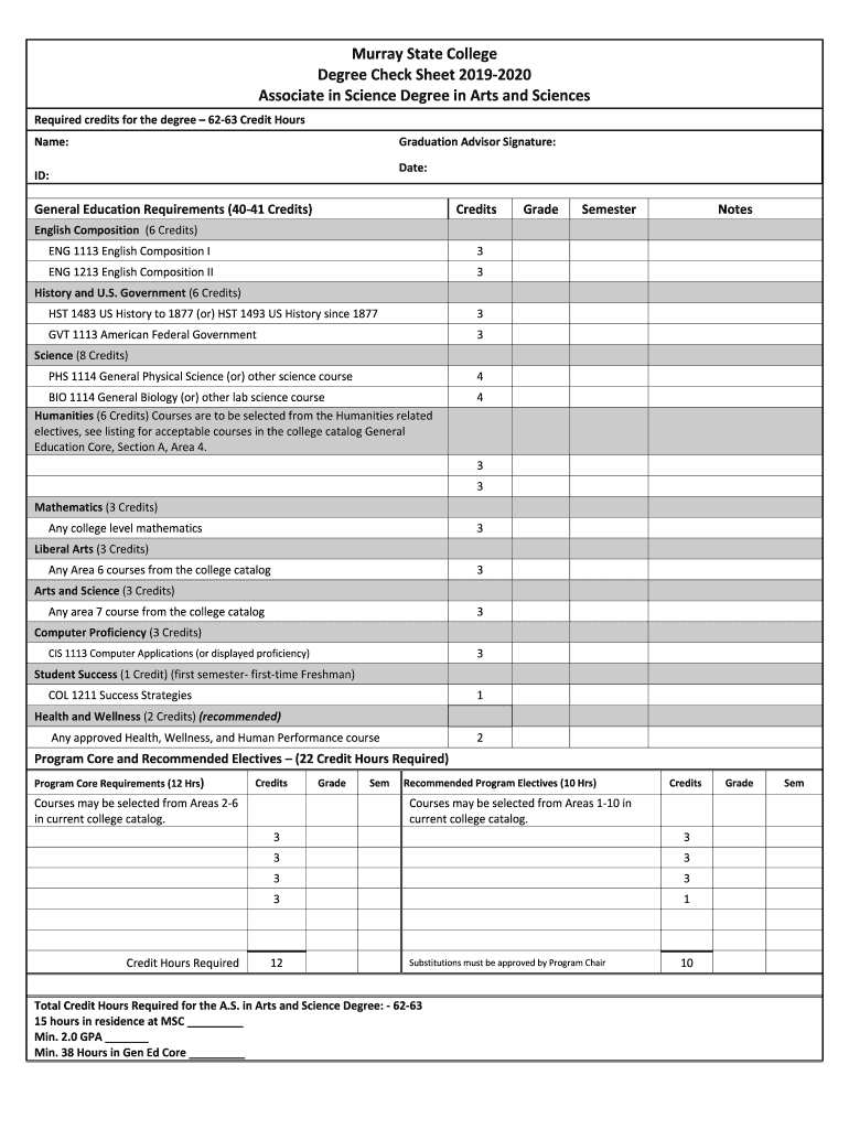 Murray State College Degree Check Sheet 20192020 Associate in Science Degree in Arts and Sciences Required credits for the degree 6263 Credit Hours Name:Graduation Advisor Signature: Date:ID:General