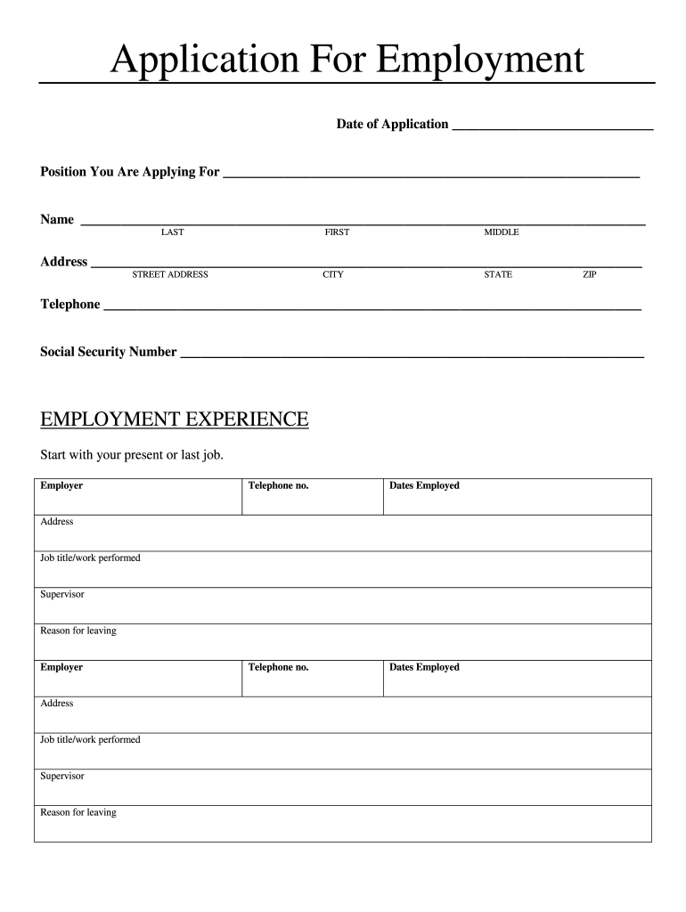 Application For Employment Date of Application Position You Are Applying For Name LASTFIRSTMIDDLEAddress STREET ADDRESSCITYSTATEZIPTelephone Social Security Number EMPLOYMENT EXPERIENCE Start with