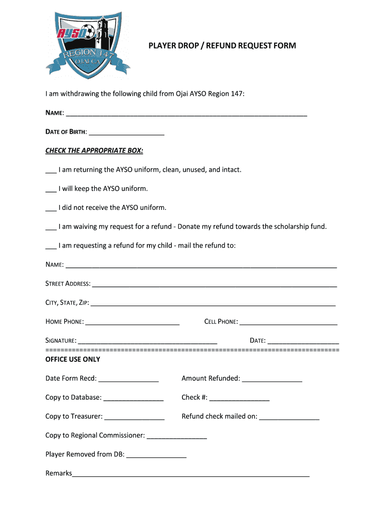 PLAYER DROP / REFUND REQUEST FORM am I withdrawing the following child from JAI ALSO Region 147: NAME: DATE OF BIRTH: CHECK THE APPROPRIATE BOX: I am returning the ALSO uniform, clean, unused, and