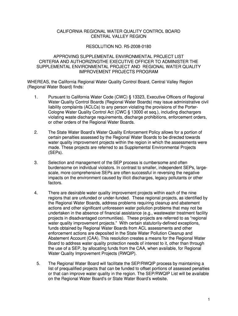 CALIFORNIA REGIONAL WATER QUALITY CONTROL BOARD CENTRAL VALLEY REGION RESOLUTION NO. R520080180 APPROVING SUPPLEMENTAL ENVIRONMENTAL PROJECT LIST CRITERIA AND AUTHORIZING EXECUTIVE OFFICER TO ADMINISTER