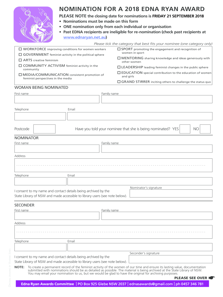 NOMINATION FOR A 2018 EDNA RYAN AWARD