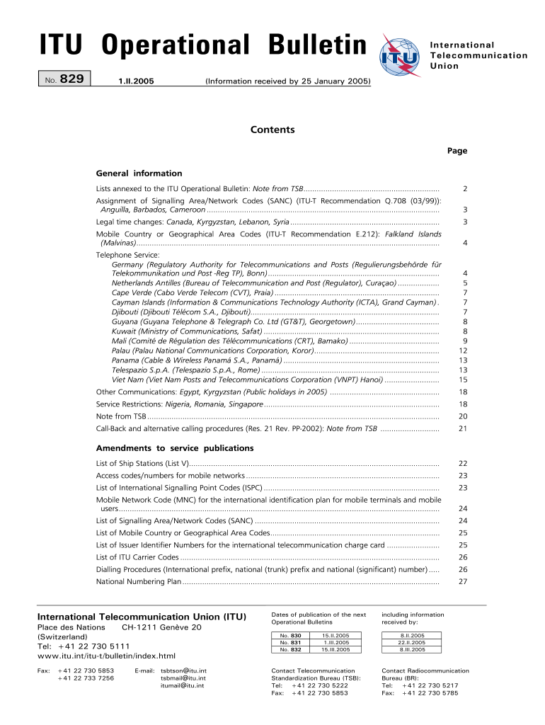 ITU Operational Bulletin No. is a document issued by the International Telecommunication Union containing information on the international numbering plan, assignment of international signaling point codes, and other relevant information.
