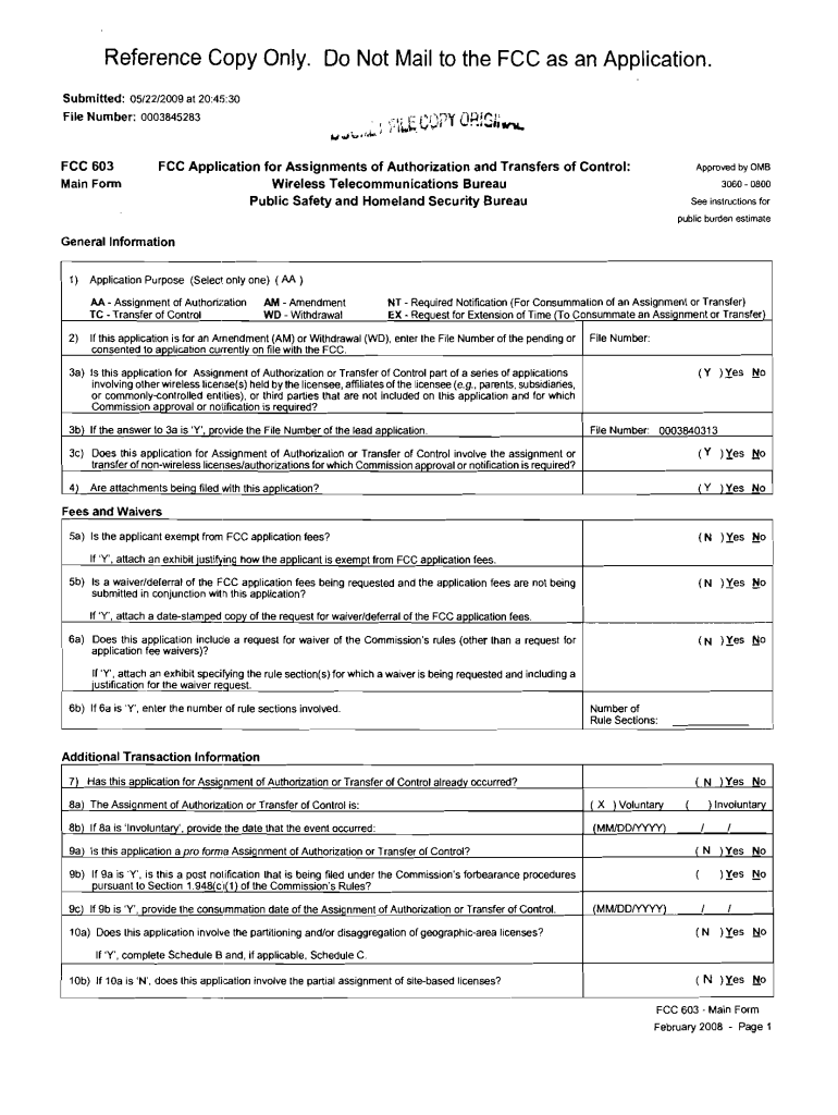 Reference Copy Only. Do Not Mail to the FCC as an Application. Submitted: 0512212009 at 20:45:30 File Number: 0003845283FCC 603 Main Connect Application for Assignments of Authorization and Transfers