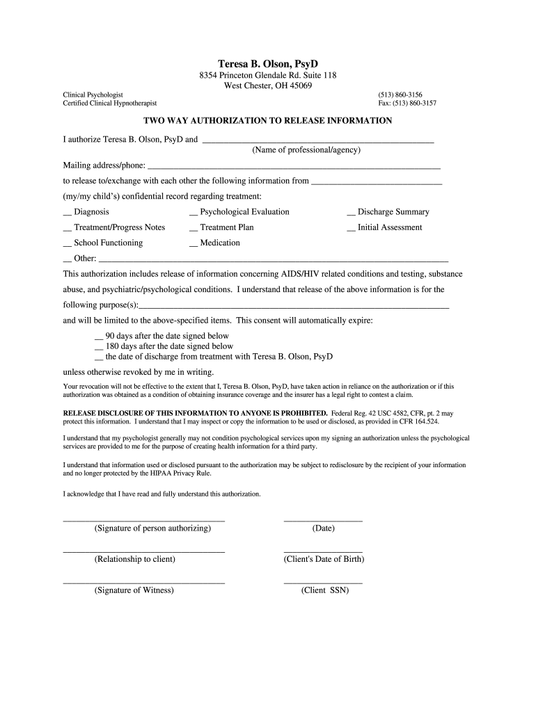 Teresa B. Olson, PSD 8354 Princeton Glendale Rd. Suite 118 West Chester, OH 45069 Clinical Psychologist Certified Clinical Hypnotherapist(513) 8603156 Fax: (513) 8603157TWO WAY AUTHORIZATION TO RELEASE