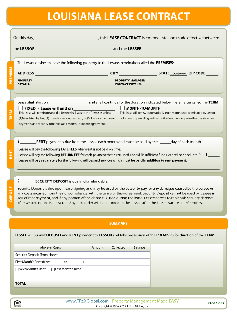 LOUISIANA LEASE CONTRACT, this LEASE CONTRACT is entered into and made effective between this day, the LESSOR and the LESSEE. Premises Lessor desires to lease the following property to the Lessee,