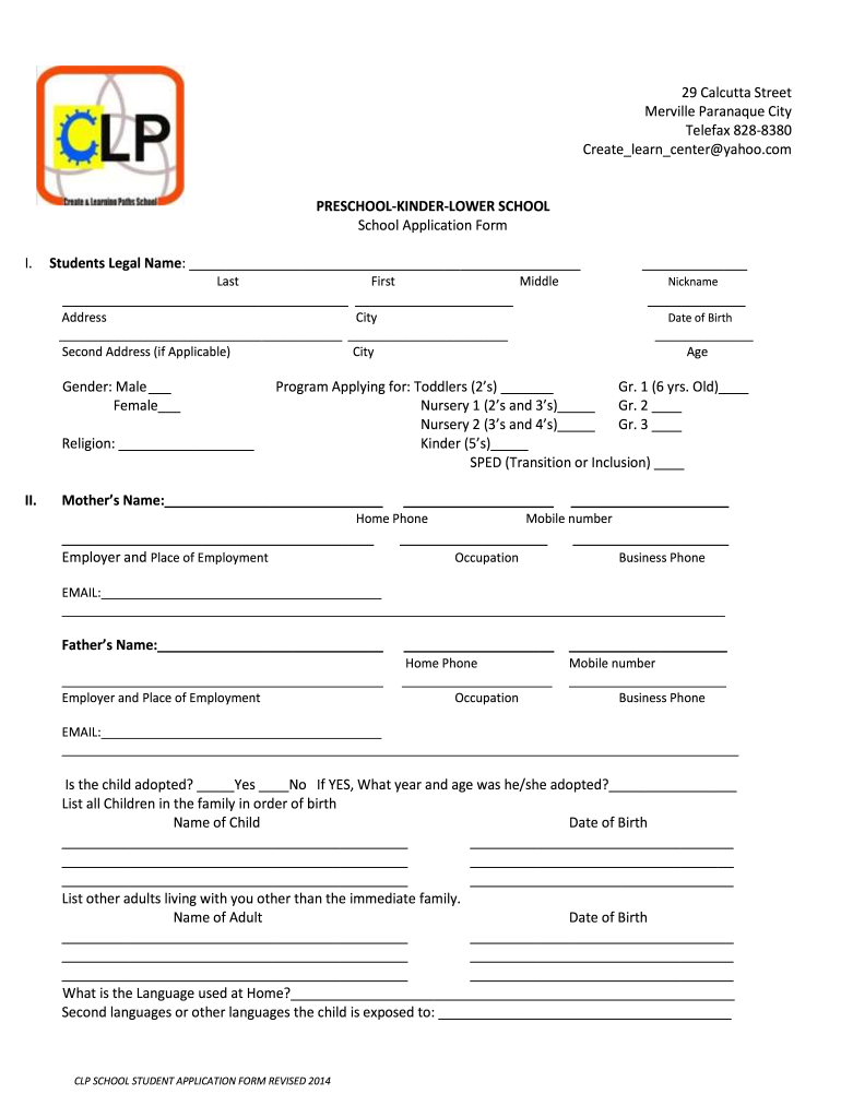 29 Calcutta Street Melville Harangue City Telefax 8288380 Create learn center yahoo.comPRESCHOOLKINDERLOWER SCHOOL Application Form I. Students Legal Name: LastFirstMiddleNickname Address Citrate