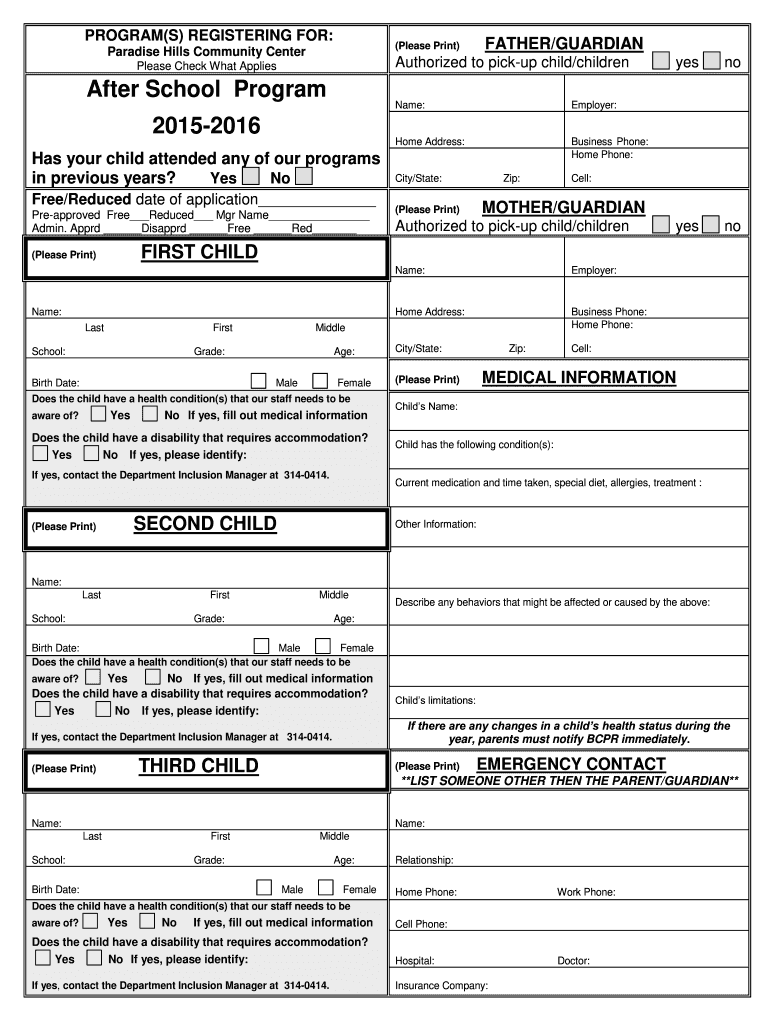 PROGRAM(S) REGISTERING FOR:(Please Print)Paradise Hills Community Center Please Check What AppliesAfter School Program 20152016 Has your child attended any of our programs in previous years? Yes No