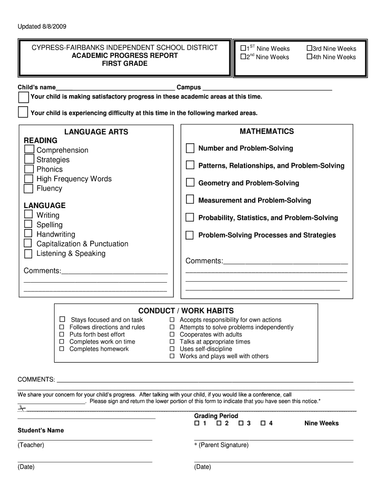The First Grade Academic Progress Report is intended for parents of first-grade students in the Cypress-Fairbanks Independent School District to keep track of academic progress.
