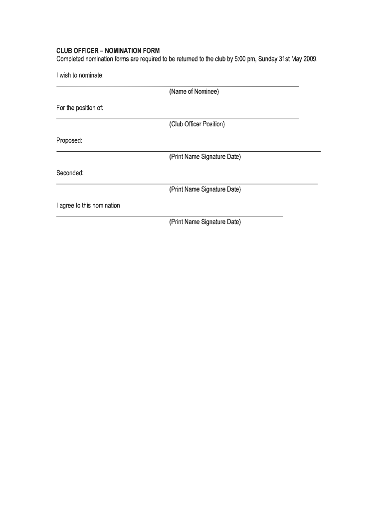 CLUB OFFICER NOMINATION FORM Completed nomination forms are required to be returned to the club by 5:00 pm, Sunday 31st May 2009. I wish to nominate: (Name of Nominee) For the position of: (Club Officer