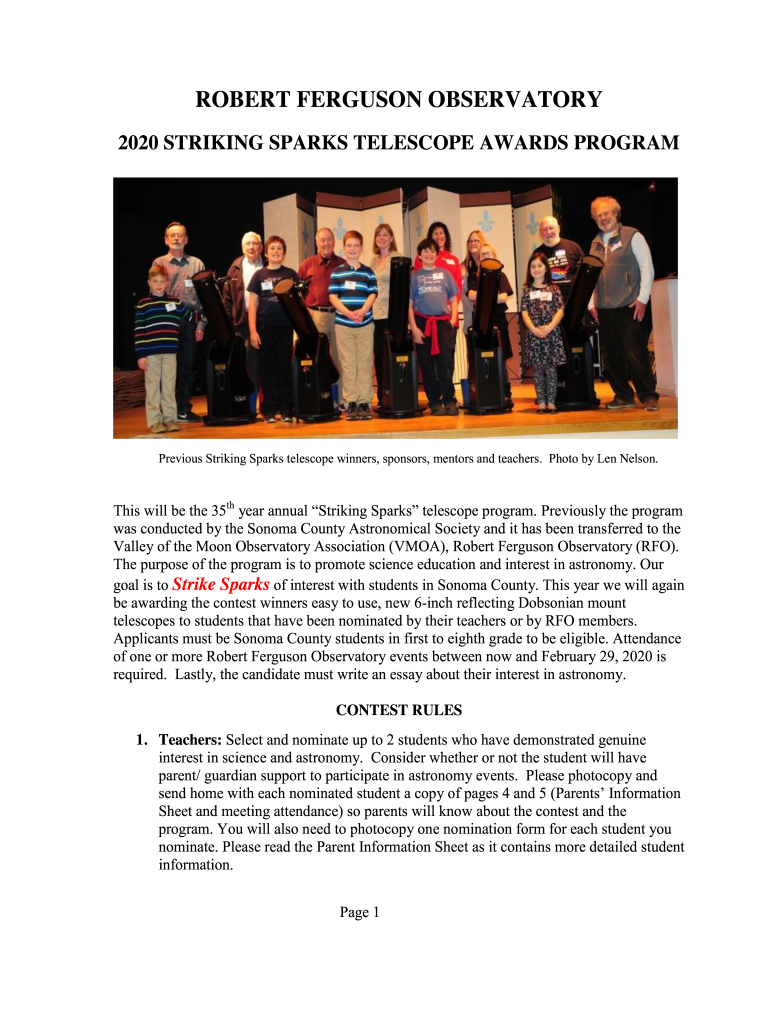 2020 STRIKING SPARKS TELESCOPE AWARDS PROGRAMPrevious Striking Sparks telescope winners, sponsors, mentors and teachers. Photo by Len Nelson. This will be the 35th year