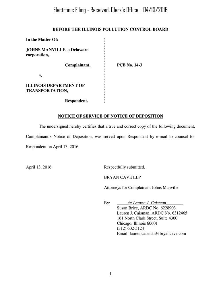 Electronic Filing Received, Clerk's Office : 04/13/2016 BEFORE THE ILLINOIS POLLUTION CONTROL BOARD In the Matter Of: JOHNS DANVILLE, a Delaware corporation, Complainant, v. ILLINOIS DEPARTMENT OF