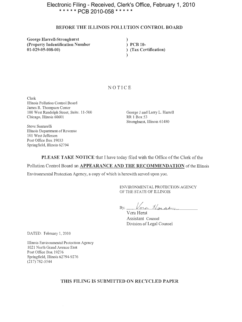 Electronic Filing Received, Clerk's Office, February 1, 2010 * * * * * PCB 2010058 * * * * * BEFORE THE ILLINOIS POLLUTION CONTROL BOARD George HarrellStronghurst (Property Iudentil1cation Number