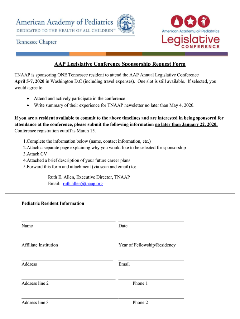 AAP Legislative Conference Sponsorship Request Form TN AAP is sponsoring ONE Tennessee resident to attend the AAP Annual Legislative Conference April 57, 2020 in Washington D. C (including travel