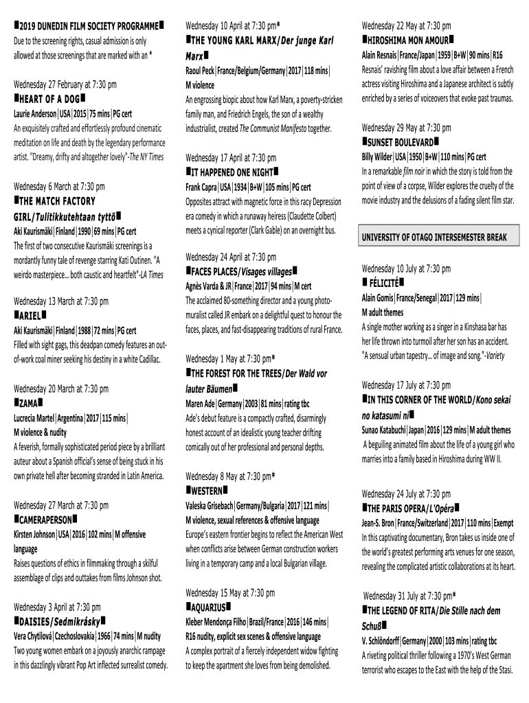 !2019 DUNEDIN FILM SOCIETY Program! Due to the screening rights, casual admission is only allowed at those screenings that are marked with an *Wednesday 27 February at 7:30 pm !HEART OF A DOG ! Laurie