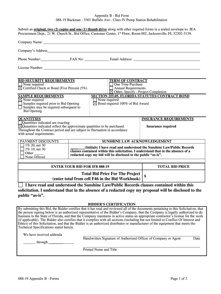 Appendix B Bid Form 08819 Beckman 5301 Buffalo Ave Class IV Pump Station Rehabilitation Submit an original, two (2) copies and one (1) thumb drive along with other required forms in a sealed envelope