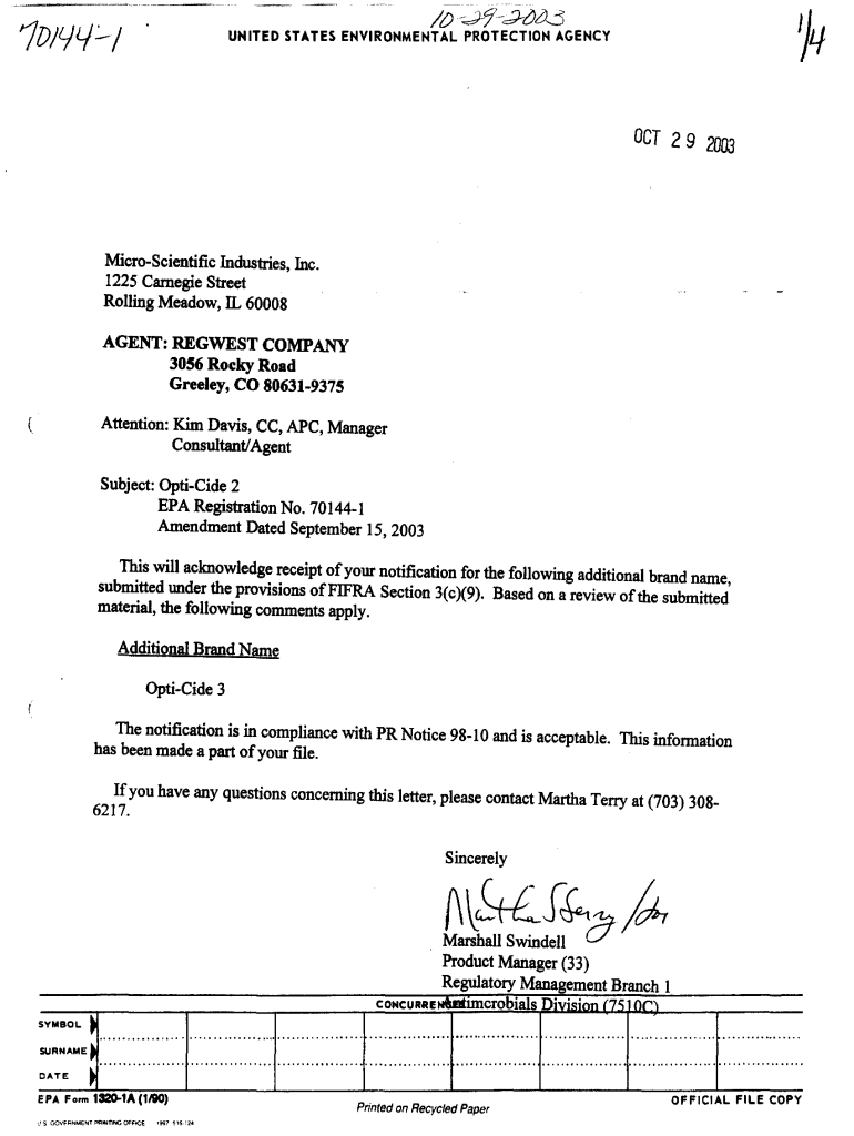 . ......./OC. J '1d)LA.:3UNITED STATES ENVIRONMENTAL PROTECTION AGENCY 29 2003MicroScientific Industries, Inc. 1225 Carnegie Street Rolling Meadow, IL 60008 AGENT: REQUEST COMPANY 3056 Rocky Road