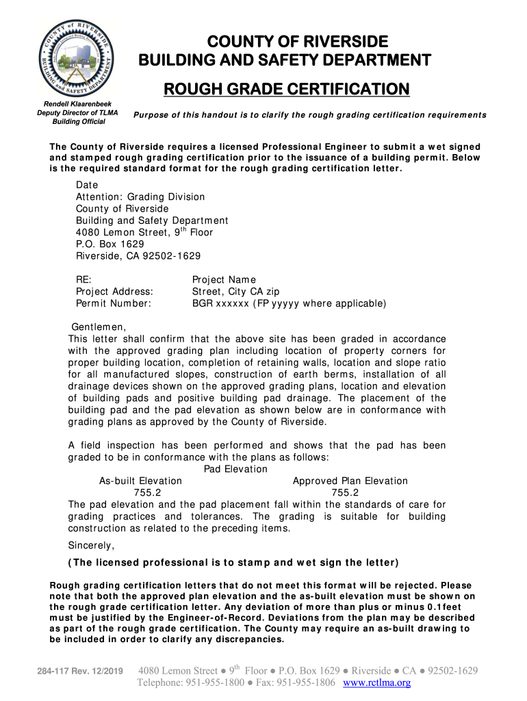 Building OfficialPurpose of this handout is to clarify the rough grading certification