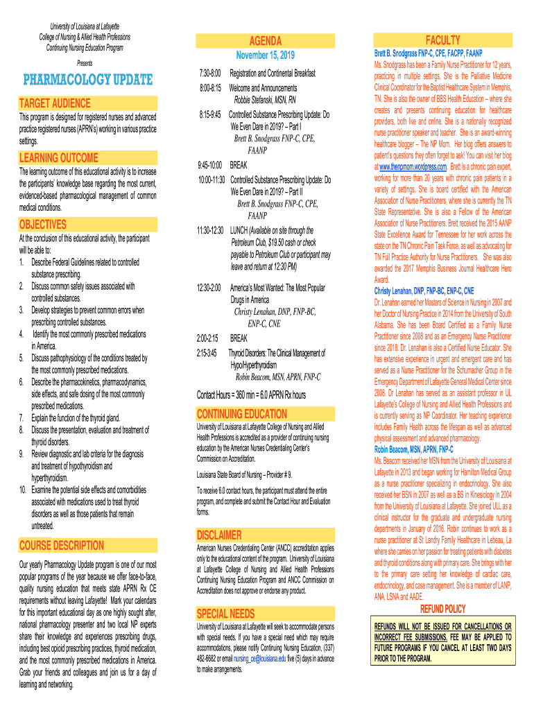 University of Louisiana at Lafayette College of Nursing & Allied Health Professions Continuing Nursing Education Program PresentsPHARMACOLOGY UPDATE TARGET AUDIENCE This program is designed for registered