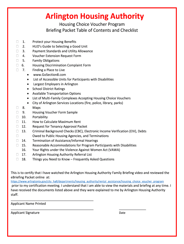 Arlington Housing Authority Housing Choice Voucher Certification Briefing Packet04202020Arlington Housing Authority Housing Choice Voucher Program Briefing Packet Table of Contents and Checklist 1.