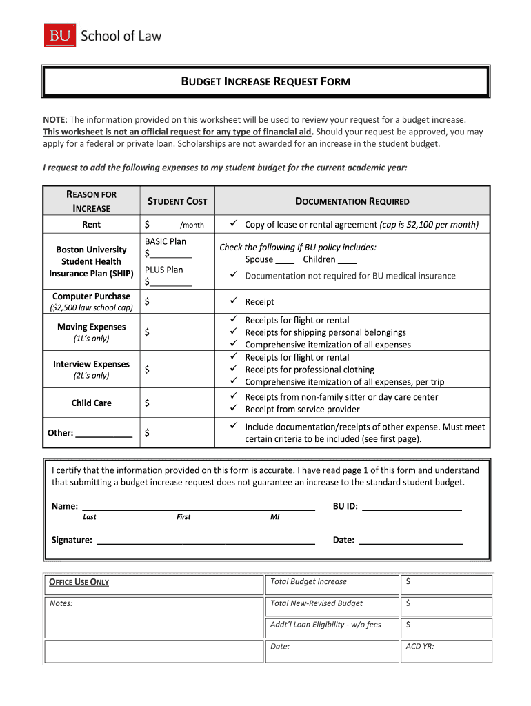 Any individual or department that requires additional funds beyond the allocated budget is required to file a budget increase request form.