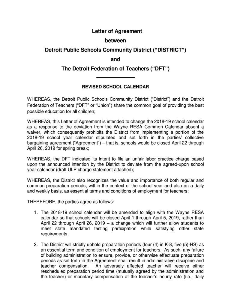 Letter of Agreement between Detroit Public Schools Community District (DISTRICT) and The Detroit Federation of Teachers (DFT) REVISED SCHOOL CALENDAR WHEREAS, the Detroit Public Schools Community