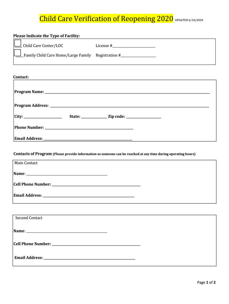 Child Care Verification of Reopening 2020 UPDATED 6/10/2020Please Indicate the Type of Facility: Child Care Center/LOC Family Child Care Home/Large FamilyLicense # Registration # Contact: Program