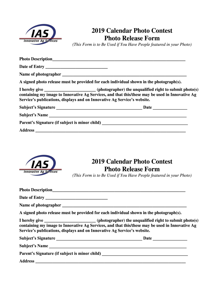 2019 Calendar Photo Contest Photo Release Form (This Form is to Be Used if You Have People featured in your Photo) Photo Description Date of Entry Name of photographer A signed photo release must