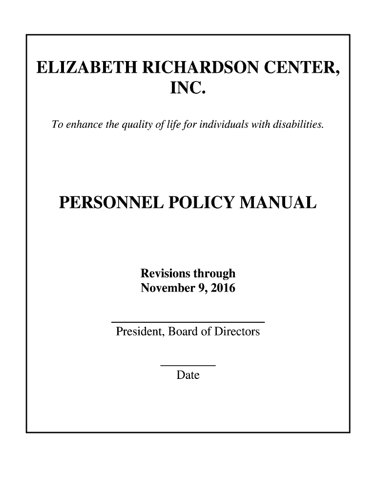 ELIZABETH RICHARDSON CENTER, INC. To enhance the quality of life for individuals with disabilities. PERSONNEL POLICY MANUALRevisions through November 9, 2016, President, Board of Directors DateEMPLOYEE