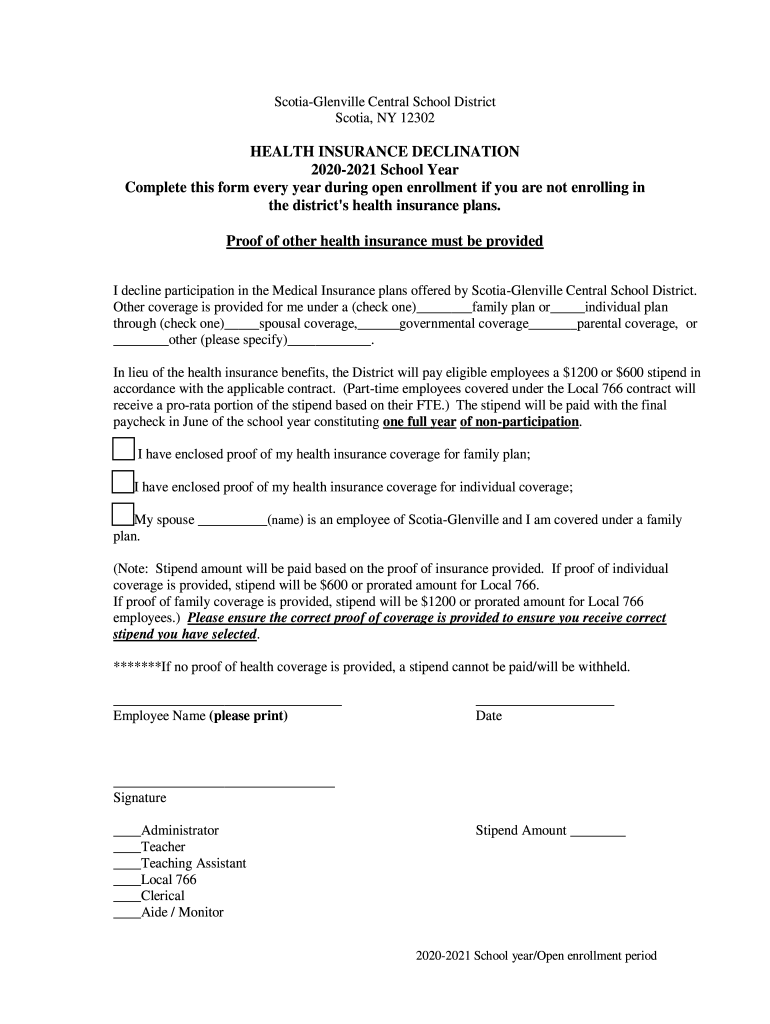 ScotiaGlenville Central School District Scotia, NY 12302HEALTH INSURANCE DECLINATION 20202021 School Year Complete this form every year during open enrollment if you are not enrolling in the district's