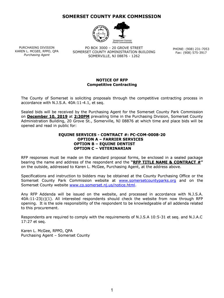SOMERSET COUNTY PARK COMMISSIONPURCHASING DIVISION KAREN L. McGee, RPO, PA Purchasing Agent PO BOX 3000 20 GROVE STREET SOMERSET COUNTY ADMINISTRATION BUILDING SOMERVILLE, NJ 08876 1262PHONE: (908)