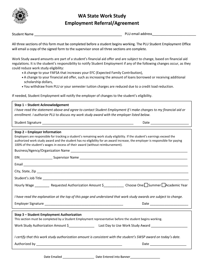 WA State Work Study Employment Referral/Agreement Student Name PLU email address All three sections of this form must be completed before a student begins working. The PLU Student Employment Office