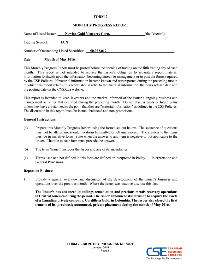 MONTHLY PROGRESS REPORT