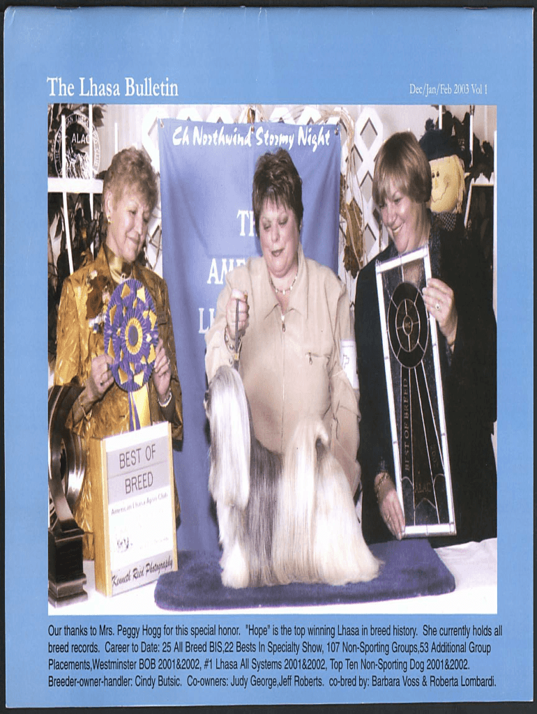 The Lhasa Bulletin Dec/Jan/Feb 2003 Vol 1Our thanks to Mrs. Peggy Hog for this special honor. “Hope is the top winning Lhasa in breed history. She currently holds all breed records. Career to Date: