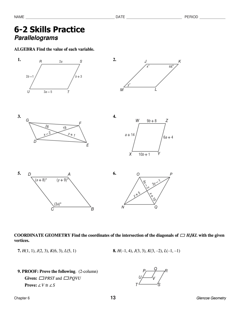 NAME DATE PERIOD 62 Skills Practice Parallelograms ALGEBRA Find the value of each variable. 1.2.3.4.5.6.COORDINATE GEOMETRY Find the coordinates of the intersection of the diagonals of vertices. 7.