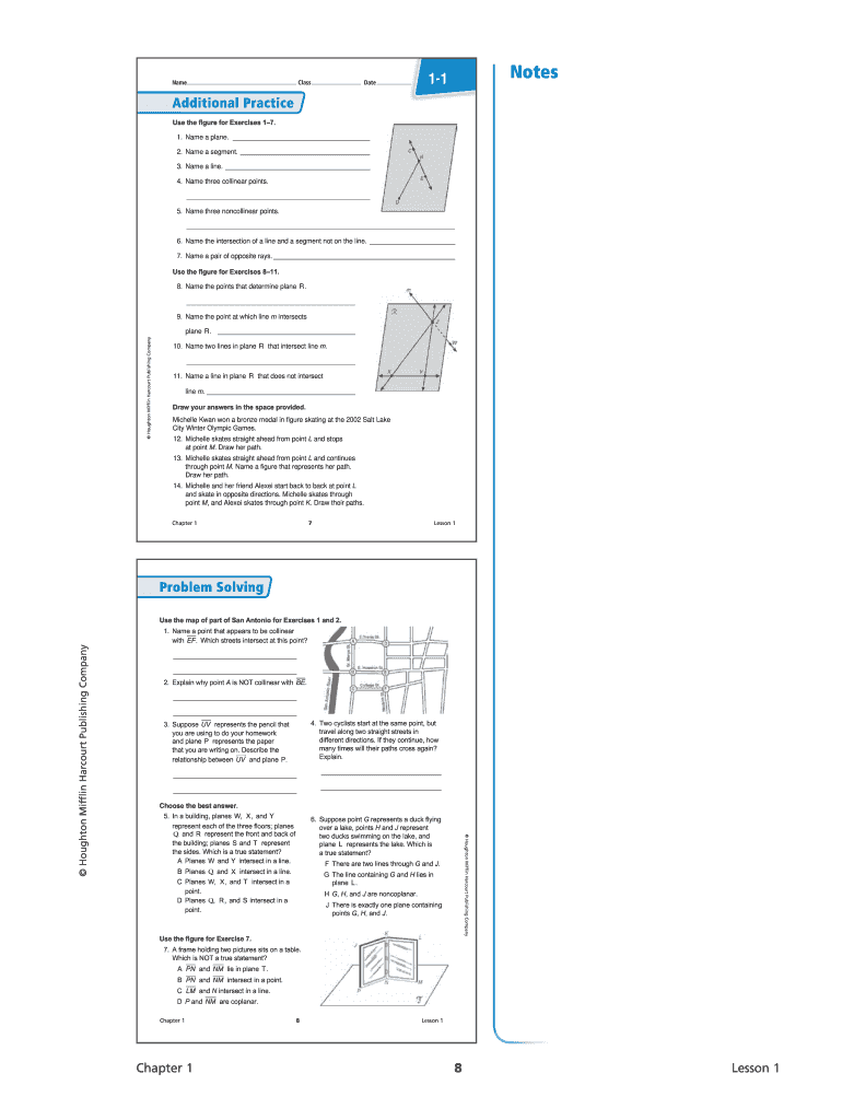 NameClassDateNotes11Additional Practice Use the figure for Exercises 17. 1. Name a plane. 2. Name a segment. 3. Name a line. 4. Name three collinear points. 5. Name three noncollinear points. 6. Name