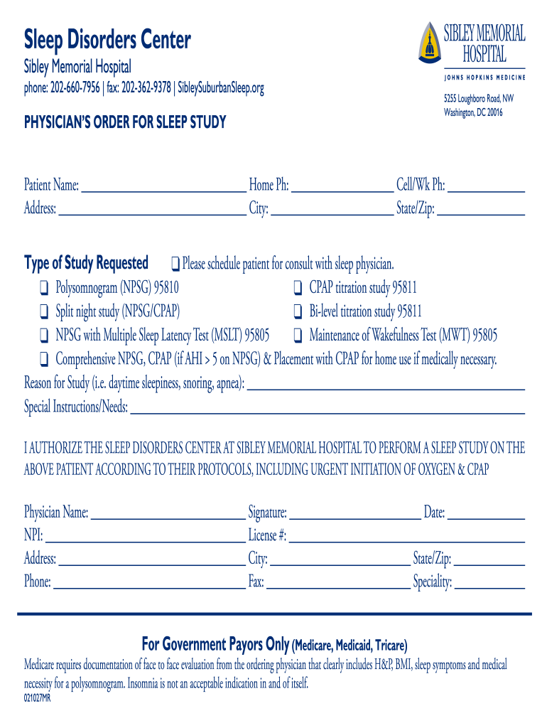 Sleep Disorders Center Bible Memorial Hospital phone: 2026607956 fax: 2023629378 SibleySuburbanSleep. Physicians ORDER FOR SLEEP STUDY Patient Name: Address:Home pH: City:5255 Longhorn Road, NW Washington,